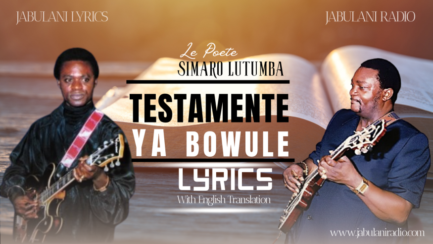 Testatement.. ba ndeko na kotanga na ko zongela eh(Testament, fellows, I am reading and rereading it.)Maloba ya Bowulé baninga na kotanga nako lela eh(The will that Bowule wrote, friends, I am reading while crying.)Nazangi na mokili oh binemi bo liesi nga poison(I lost.. rivals, you fed me with poison.)Luambo na sala fielé wapi oh mokili esilisi nga lolendo lelo na ndimi(Luambo, how can I show off? The joke is on me.)